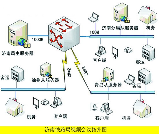 由于路局改革后組織結(jié)構(gòu)的特點(diǎn),決定了跨地域會(huì)議較多,如濟(jì)南和徐州、青島之間召開(kāi)的部門(mén)級(jí)別的會(huì)議比較頻繁,加上三地之間的帶寬制約,本方案采用了主從服務(wù)器的系統(tǒng)架構(gòu),1主3從,主服務(wù)器設(shè)置在路局網(wǎng)絡(luò)中心,原來(lái)濟(jì)南分局位置設(shè)置1臺(tái)從服務(wù)器,負(fù)責(zé)濟(jì)南地區(qū)的內(nèi)部會(huì)議,以及與其他2地的遠(yuǎn)程會(huì)議,同樣徐州、青島也各設(shè)置1臺(tái)從服務(wù)器。