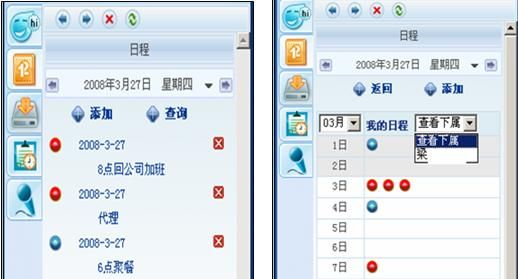 我們用過OUTLOOK的電子日程和手機(jī)自帶的日程功能都知道,電腦本機(jī)和手機(jī)實現(xiàn)日程管理都又各自很大的局限性,優(yōu)你客巧妙的實現(xiàn)了日程的網(wǎng)絡(luò)化管理并可以捆綁在手機(jī)提醒上,獨特又實用。其中紅綠日程各自代表工作和個人事務(wù),其中工作日程還能共享給上級。