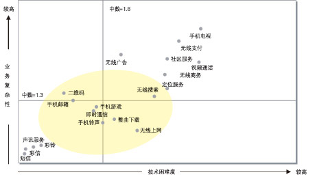 諾基亞西門子通信借鑒國(guó)外的無(wú)限增值業(yè)務(wù)經(jīng)驗(yàn)和對(duì)國(guó)內(nèi)運(yùn)營(yíng)商業(yè)務(wù)的分析提出“技術(shù)困難度—業(yè)務(wù)復(fù)雜性”模型來(lái)詮釋無(wú)線增值業(yè)務(wù)。