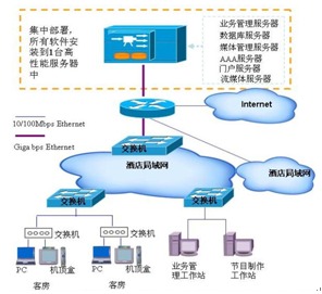 鄂州酒店級IPTV系統(tǒng)采用運營平臺集中部署,中心運營平臺涵蓋了中心媒體服務(wù)器,內(nèi)容管理服務(wù)器,門戶服務(wù)器,業(yè)務(wù)管理服務(wù)器,數(shù)據(jù)庫服務(wù)器,AAA服務(wù)器,網(wǎng)管服務(wù)器、視頻編碼器、流媒體服務(wù)器等,后期根據(jù)客戶量的增加,可以將多媒體服務(wù)器獨立出來進行分布式的二層部署。