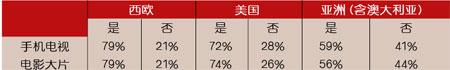 在被問及每月愿意花多少錢來收看手機電視和電影大片時,歐洲和美國的被調(diào)查者表示出非常低的支付意愿。在歐洲,79%的被調(diào)查者不愿意為手機電視和電影支付費用,美國的情況更糟糕,澳大利亞的回答則與歐洲的回答非常接近。在亞洲,59%的被調(diào)查者不愿為這些服務(wù)支付費用。在日本,72%的被調(diào)查者不愿為手機電視付費,但是對于支付手機電影大片的反對率下降到了55%。(見表2)