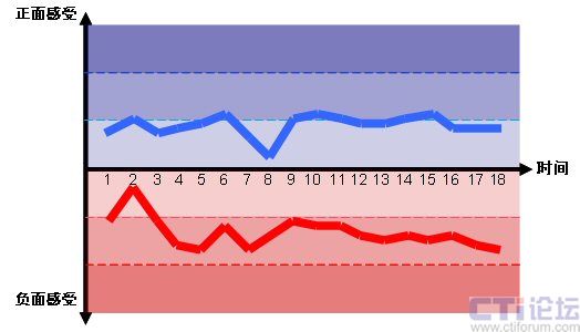 圖2的情感曲線分別是中國移動的“喜愛”情感曲線和中國電信的“討厭”情感曲線,對應(yīng)于雙方整個呼入電話體驗18個子流程上的情感感受。(注意,我們只列出了中國移動的“喜愛”曲線和中國電信的“討厭”曲線來舉例說明。)