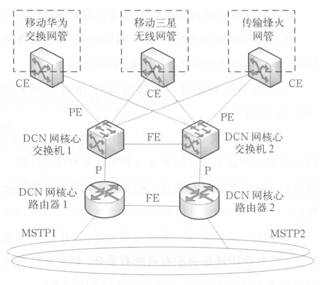 P路由器和PE設備為口字形連接,各自通過VRRP 協(xié)議進行熱備。P設備直接通過FE口接入MSTP傳輸網(wǎng)。