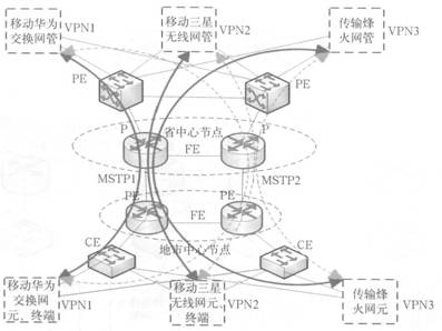 采用MPLS VPN技術可以把現(xiàn)有的物理實體IP網(wǎng)絡分解成邏輯上隔離的網(wǎng)絡,各隔離開的網(wǎng)絡之間感知不到對方網(wǎng)絡的存在。在物理上是同一硬件設備承載,但在邏輯上網(wǎng)絡是完全隔離的。0SS承載網(wǎng)正是需要這樣的一種承載方式,把各專業(yè)各廠家的多種網(wǎng)管配置到不同的邏輯業(yè)務區(qū)VPN中,如移動華為交換網(wǎng)管配置到VPNl中,移動三星無線網(wǎng)管配置到VPN2中,傳輸烽火網(wǎng)管配置到VPN3中,對每一套網(wǎng)管系統(tǒng)都使用同樣的物理承載不同的VPN完成從地市分公司的網(wǎng)元或終端到網(wǎng)管服務器的連接,各VPN之間相互獨立、相互隔離。