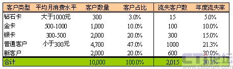 因?yàn)楦叨丝蛻粼诶麧?rùn)貢獻(xiàn)中所起的巨大作用,通過簡(jiǎn)單的計(jì)算即可得出,每一名鉆石卡客戶流失帶來的利潤(rùn)損失,相當(dāng)于9.4名銀卡客戶流失帶來的損失,或相當(dāng)于50名普通客戶流失帶來的損失,或相當(dāng)于125名新用戶流失帶來的直接損失。