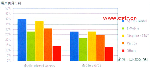 美國的移動(dòng)搜索業(yè)務(wù)發(fā)展迅速,領(lǐng)先全球市場。根據(jù)美國市場調(diào)查公司的調(diào)查,美國移動(dòng)用戶中,經(jīng)常使用移動(dòng)搜索的用戶達(dá)到22%。美國主流運(yùn)營商均已經(jīng)推出了移動(dòng)搜索業(yè)務(wù),其中Sprint和合并后的Cingular/AT&T業(yè)務(wù)發(fā)展較好。