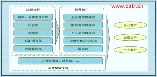 新型的融合產(chǎn)品和服務(wù)突破了原來(lái)的技術(shù)界限,如果還延續(xù)原有的按技術(shù)劃分的部門(mén)管理結(jié)構(gòu),必將產(chǎn)生過(guò)多的分支部門(mén),造成企業(yè)結(jié)構(gòu)龐雜、效率低下,對(duì)新的綜合服務(wù)的市場(chǎng)需求缺乏感受力,新服務(wù)無(wú)法及時(shí)推向市場(chǎng)的問(wèn)題。因此,重新進(jìn)行部門(mén)劃分,實(shí)現(xiàn)內(nèi)部的協(xié)調(diào)配合是十分必要的。而業(yè)務(wù)提供的融合性、多元化及客戶(hù)的統(tǒng)一服務(wù)需求,使這種組織結(jié)構(gòu)的重新構(gòu)建最終將以客戶(hù)為中心進(jìn)行構(gòu)建:在前端以客戶(hù)為中心劃分運(yùn)營(yíng)部門(mén),實(shí)現(xiàn)對(duì)客戶(hù)的直接服務(wù),在后端,以業(yè)務(wù)、運(yùn)維等職責(zé)為中心部署組織結(jié)構(gòu),形成對(duì)運(yùn)營(yíng)執(zhí)行的支撐。