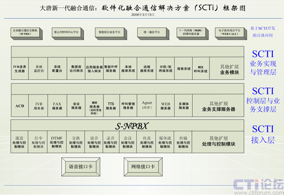 案例:我與大唐中聯(lián)(大唐融合)、和創(chuàng)世紀(jì)、華夏成訊等公司的技術(shù)開發(fā)人員經(jīng)過幾年來的摸索與實踐開發(fā),提出軟件化融合通信解決方案(SCTI)。通過計算機的軟件(通信服務(wù)系統(tǒng))來實現(xiàn)交換機上的所有通信功能,在互聯(lián)網(wǎng)上實現(xiàn)所有傳統(tǒng)通信網(wǎng)上的所有功能、還實現(xiàn)互聯(lián)網(wǎng)上的新的通信功能,在與傳統(tǒng)通信網(wǎng)上相連,只需增加一塊語音接口卡,就能實現(xiàn)互聯(lián)網(wǎng)與傳統(tǒng)通信的統(tǒng)一。此方案的成本比統(tǒng)一通信、融合通信等解決方案的成本要降幾十倍到上百倍。