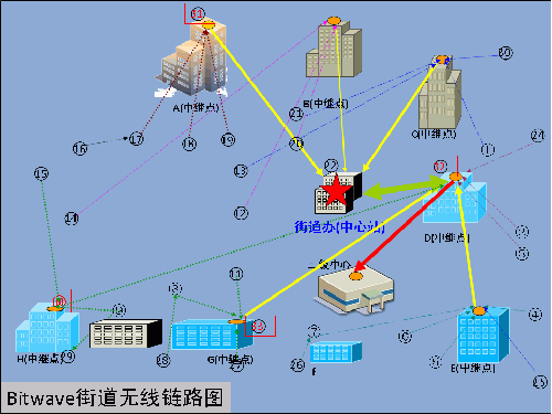 例如,遠(yuǎn)端地面點(diǎn)與主控中心有樓房、樹木等障礙物遮擋,Bitwave采用中繼的模式,在遠(yuǎn)端地面點(diǎn)和中心點(diǎn)都可視的高點(diǎn)建筑物上架設(shè)一收一發(fā)的兩臺(tái)BWB210無線網(wǎng)橋,通過功分器或交換機(jī)將遠(yuǎn)端點(diǎn)的信號(hào)傳送到中心點(diǎn),很好的解決了遠(yuǎn)端點(diǎn)與中心點(diǎn)不可視情況下鏈路無法搭建的問題。