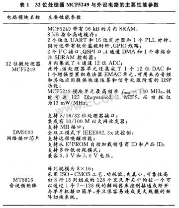 MCF5249模塊單元主要由32位處理器MCF5249和若于外圍器件AM29LV160DB90快閃存儲器、K4S281632SDRAM、SP3223串行通訊電路、DM9000網(wǎng)絡(luò)接口芯片、MT8816音視頻矩陣電路等硬件構(gòu)成。其主要性能如下表1所示。