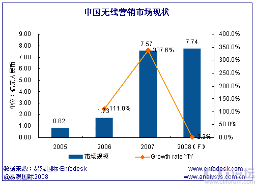 易觀國(guó)際(Analysys International)研究發(fā)現(xiàn),中國(guó)無線營(yíng)銷市場(chǎng)經(jīng)過2007年的高速發(fā)展后,2008年已經(jīng)進(jìn)入了商業(yè)模式探索階段,從市場(chǎng)規(guī)模上看,2008年全年無線營(yíng)銷市場(chǎng)規(guī)模僅比上年增長(zhǎng)2.3%。易觀國(guó)際(Analysys International)認(rèn)為,無線營(yíng)銷市場(chǎng)增速的明顯放緩主要由于短信廣告市場(chǎng)的萎縮,短信廣告是無線營(yíng)銷市場(chǎng)最大的細(xì)分領(lǐng)域,2007年曾經(jīng)占整個(gè)無線營(yíng)銷市場(chǎng)規(guī)模的72.7%。