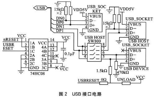 在ARM9開發(fā)板內(nèi)部含有1個USB2.O接口控制器,接口電路如圖2所示。共有3個LISB接口(2個Host和1個Device),通過選擇開關(guān)SW800進行選通控制。74HC08作為4個二輸入與門邏輯電路,負責(zé)控制信號的邏輯組合。該接口用來連接USB接口的外部設(shè)備。