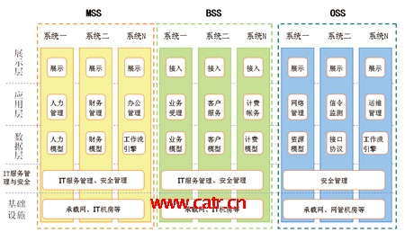 從系統(tǒng)部署來看,目前各大運營企業(yè)都以集團與省公司為主要的建設與管理維護單位,建成了集團與省兩級模式的支撐系統(tǒng)。集團公司的系統(tǒng)主要提供面向全公司的企業(yè)管理、經營分析等功能;省公司從職能管理單位逐步轉向了兼顧管理、生產的單位,具有了越來越多的生產職能,在運營支撐系統(tǒng)建設中的作用較為突出,一般情況下,在遵循集團公司的總體指導思想下,可自行規(guī)劃與建設本省的支撐系統(tǒng);市公司的生產職能有所削弱,主要負責市場營銷、客戶支撐以及設備的現(xiàn)場維護等工作,因而主要是支撐系統(tǒng)的使用單位。