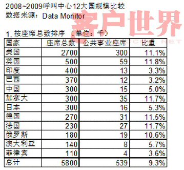 根據(jù)Data Monitor公司近年的分析報(bào)告,12呼叫中心大國在2008~2009年度共有呼叫中心座席580萬個(gè),其中公共事業(yè)類呼叫中心座席54萬個(gè),占9.3%。