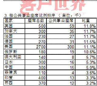 美國擁有全世界最多的座席,達(dá)到270萬個(gè),公共事業(yè)座席30萬個(gè),占11.1%;除美國以外,公共事業(yè)類座席總數(shù)排名在第2~6名的依次是:英國,加拿大,德國,法國,俄羅斯。