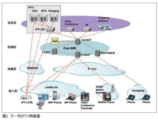基于網(wǎng)絡(luò)視訊框架的下一代IPTV架構(gòu)堅(jiān)持業(yè)務(wù)與網(wǎng)絡(luò)、信令與媒體相分離的設(shè)計(jì)思想,以IMS為交換核心網(wǎng),以APP應(yīng)用服務(wù)器為業(yè)務(wù)引擎,以CDN為媒體分發(fā)網(wǎng)絡(luò),兼容移動網(wǎng)絡(luò)、寬帶網(wǎng)絡(luò)和IMS/NGN網(wǎng)絡(luò),支持IPTV機(jī)頂盒、PC、智能終端,乃至3G終端(包含CS、PS域)等多樣化的類型終端,從而提供網(wǎng)絡(luò)電視、視頻點(diǎn)播、信息服務(wù)、PVR、TSTV、游戲、視頻通信等內(nèi)容豐富且無所不在的IPTV業(yè)務(wù)。