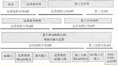 在某種意義上,下一代網(wǎng)絡(luò)必須是一種可編程的、基于IP的網(wǎng)絡(luò),這必然要求XG為應(yīng)用開發(fā)提供強大的、方便的、定義明確的API。對于一些業(yè)務(wù)提供商來說,API思想本身并非僅僅是一個基本概念。目前,公共API是指所有第三方都可用的API,它包括標(biāo)準(zhǔn)的、開放的API子集。另一方面,專用API是指由某個公司控制、僅僅在公司內(nèi)部或合作伙伴內(nèi)部可用的API。圖1給出了下一代網(wǎng)絡(luò)API體系結(jié)構(gòu)的一種高級分類方法。