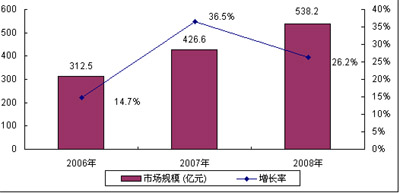 圖3 2006-2008年中國通信設備市場規(guī)模及增長