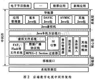 為了支持交互電視的發(fā)展,國際上許多組織制訂了相關(guān)的中間件標(biāo)準(zhǔn),比如歐洲D(zhuǎn)VB提出的MHP,美國針對有線電視系統(tǒng)由Cablelabs提出的OCAP,美國ATSC提出的DASE等,其中MHP標(biāo)準(zhǔn)應(yīng)用最為廣泛。圖2提出的中間件架構(gòu)符合國家數(shù)字電視中間件標(biāo)準(zhǔn)(草案),以JavaTM語言為基礎(chǔ),在MHP基礎(chǔ)上去除了MHP包中的冗余部分。