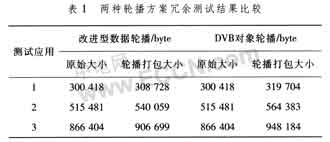 表l比較了改進型數(shù)據(jù)輪播和DVB對象輪播方案打包前后的數(shù)據(jù)。由表1可知,改進型數(shù)據(jù)輪播引入的帶寬冗余信息要小于對象輪播,可為平臺節(jié)省更多的帶寬資源。