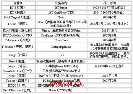 另外一個亮點是法國電信(Orange)于2008年11月底在Unik品牌下(Unik是Orange于2006年10月推出的FMC業(yè)務品牌,目前在法國已經擁有100萬用戶)開通了高清移動電視業(yè)務,向法國用戶提供60多個高清移動電視頻道。該業(yè)務基于Orange于2008年9月開通的3G+UMA平臺,可實現(xiàn)WiFi網(wǎng)絡與3C網(wǎng)絡的平滑切換。該業(yè)務的推出,使FMC從最初的以話音業(yè)務為主擴展到視頻業(yè)務,基于融合性終端的業(yè)務越來越豐富,是FMC領域的一大進步(表1)。