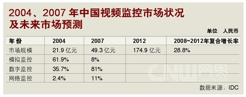 IDC的數(shù)字同樣樂(lè)觀。跟據(jù)IDC在2008年的預(yù)測(cè),2008~2012年,中國(guó)視頻監(jiān)控市場(chǎng)的年均復(fù)合增長(zhǎng)率將達(dá)28.8%,遠(yuǎn)高于IT市場(chǎng)投入的平均增長(zhǎng)率。而在模擬、數(shù)字與IP模式(即網(wǎng)絡(luò)監(jiān)控)組成的視頻監(jiān)控市場(chǎng)里,IP的增長(zhǎng)率又將高于前二者,成為市場(chǎng)增長(zhǎng)的強(qiáng)勁動(dòng)力!保ㄗⅲ耗M監(jiān)控是指圖像信號(hào)在采集后,通過(guò)模擬信號(hào)傳輸?shù)姆忾]式視頻監(jiān)控系統(tǒng)模式;數(shù)字監(jiān)控是指圖像信號(hào)在采集后,經(jīng)過(guò)編碼轉(zhuǎn)化成數(shù)字信號(hào)再進(jìn)行傳輸?shù)姆忾]或半封閉式視頻監(jiān)控系統(tǒng)模式;網(wǎng)絡(luò)監(jiān)控是指系統(tǒng)建立在以網(wǎng)絡(luò)為基礎(chǔ)的傳輸平臺(tái)的開(kāi)放式視頻監(jiān)控系統(tǒng)模式)。