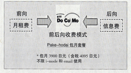 當然,移動互聯(lián)網(wǎng)運營不僅可以前向向用戶收費,還可以采取后向的廣告收費模式,如圖NTT DoCoMo的數(shù)據(jù)業(yè)務(wù)資費模式:
