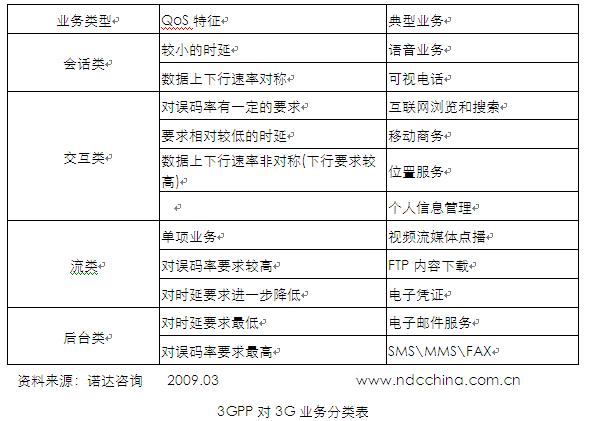 3GPP作為3G標(biāo)準(zhǔn)的研究組織,根據(jù)業(yè)務(wù)內(nèi)在技術(shù)要求把3G業(yè)務(wù)分成四類,主要包括會(huì)話類業(yè)務(wù)、交互類業(yè)務(wù)、流類業(yè)務(wù)、后臺(tái)類業(yè)務(wù)。此種劃分方法主要關(guān)注的是業(yè)務(wù)的技術(shù)質(zhì)量保證,對業(yè)務(wù)應(yīng)用、業(yè)務(wù)場景、業(yè)務(wù)對生活的影響關(guān)注較少,但這種分類可以清晰的體現(xiàn)業(yè)務(wù)最底層的技術(shù)要求及業(yè)務(wù)與網(wǎng)絡(luò)相互影響。