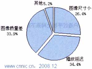 對(duì)于手機(jī)視頻用戶而言,目前最大的問(wèn)題在于視頻圖像的播放延遲問(wèn)題以及圖像質(zhì)量太差,兩者比例分別為 34.4%和33.9%。引起這兩種問(wèn)題的最大因素是電信運(yùn)營(yíng)商的網(wǎng)絡(luò)問(wèn)題,目前的2.5G和2.75G網(wǎng)絡(luò)對(duì)于數(shù)據(jù)的快速傳輸仍有很大的瓶頸。