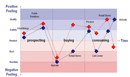 看一看“情感曲線”也許你就會(huì)頓悟。此處所示的兩條曲線來自兩個(gè)國(guó)際銀行。請(qǐng)注意曲線的不同之處。紅線所示的銀行與藍(lán)線所示的銀行相比在呼叫中心服務(wù)和店內(nèi)體驗(yàn)上都要略勝一籌。而藍(lán)線所示銀行在網(wǎng)上銀行這一項(xiàng)上表現(xiàn)更好!凹t線”銀行的競(jìng)爭(zhēng)資本是其卓越的客戶互動(dòng)體驗(yàn),無論是分行的面對(duì)面互動(dòng)還是來自聯(lián)絡(luò)中心的遠(yuǎn)程體驗(yàn)都屬一流。