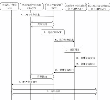 - 會話控制實體收到IPTV業(yè)務請求后,根據(jù)用戶所在的地理位置、用戶類型等信息選擇為該用戶服務的CDN-CF,并向CDN-CF發(fā)送媒體資源請求。