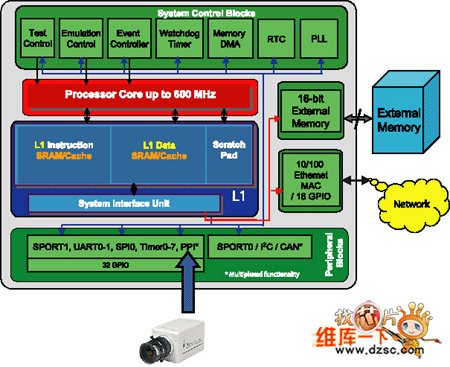 由于同時具有網(wǎng)絡(luò)、控制和信號處理功能,ADSP-BF537能夠在諸如視頻監(jiān)控、遠(yuǎn)程檢測(使用ADC和DAC進(jìn)行測量)和IP視頻等領(lǐng)域?qū)崿F(xiàn)低成本、高性能的應(yīng)用。