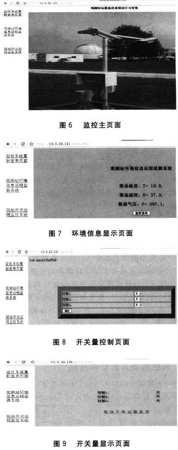 該監(jiān)控主頁(yè)面左側(cè)顯示有3個(gè)模塊:重新登陸頁(yè)面;觀測(cè)站遠(yuǎn)程環(huán)境信息檢測(cè)系統(tǒng),能方便實(shí)時(shí)地查詢現(xiàn)場(chǎng)的環(huán)境狀態(tài),如圖7所示;現(xiàn)場(chǎng)開(kāi)關(guān)的遠(yuǎn)程監(jiān)控系統(tǒng),可以控制3個(gè)開(kāi)關(guān)量的開(kāi)關(guān),如圖8所示,并能查詢它們當(dāng)前狀態(tài),設(shè)置監(jiān)控頁(yè)面每隔15