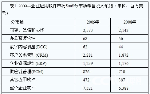 在Gartner的統(tǒng)計中,SaaS領(lǐng)域中,除了CRM之外,內(nèi)容、通訊和協(xié)作市場同樣表現(xiàn)不俗,在2009年,這一市場的銷售收入將從2008年的21.4億美元增長到26億美元,甚至超過了CRM分市場的23億美元。其他如ERP分市場等同樣占據(jù)不小的份額。