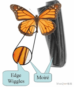 為了反映鏡像邊帶沒有衰減的效果,圖3b和3c示意了奈奎斯特頻率和時鐘頻率處的頻譜重疊。這些疊加的鏡像邊帶信號(圖3d)與視頻信號相比具有隨機的相位差。圖4表示我們需要避免的圖像誤差!斑吘墧[動”是高頻邊緣干擾,它重疊在視頻信號上,具有隨機變化的相位。摩爾效應(yīng)是時鐘、視頻信號頻率之間相互作用的結(jié)果。