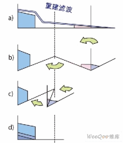 從圖5可以看出重建濾波器的作用,利用參考書中提供的定理可以很容易理解頻譜混疊。通常,在頻域,頻率和放大倍數(shù)都采用對數(shù)刻度,重建濾波器的頻響特性表現(xiàn)為平滑曲線。然而,為了說明邊帶重疊的位置,我們用線性坐標表示頻率和放大倍數(shù)。為了表示低通濾波器在同樣刻度坐標下的衰減特性,從濾波器頻響曲線可以看出:對于有用的視頻信號衰減很少,對于鏡像頻率衰減較大。圖5b和5c顯示了混疊效應(yīng),但是應(yīng)該注意到,與圖3d相比,圖5d中的鏡像頻率被顯著衰減。