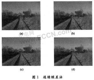 綜合考慮以上四種背景提取方法,本文采用結(jié)合多幀圖像平均法和連續(xù)幀差法這兩種方法來進(jìn)行視頻序列背景的提取?紤]到運動目標(biāo)的多樣性,有目標(biāo)經(jīng)過視場而引起的變化長時間內(nèi)可忽略不計。多幀圖像平均法時將運動目標(biāo)看作為噪聲,用累加平均的方法消除噪聲,利用目標(biāo)運行一段時間的序列圖像進(jìn)行平均而得到視場背景圖像。連續(xù)幀差算法是通過當(dāng)前幀的圖像與前一幀圖像的差值找到運動區(qū)域,對運動區(qū)域的背景保持不變,而非運動區(qū)域的背景則用當(dāng)前幀進(jìn)行更新,經(jīng)過一段時間的迭代便可提取出背景。兩種方法的結(jié)合可以很好地彌補各自的缺點,能夠適應(yīng)鐵路沿線周邊環(huán)境的要求,對存在運動目標(biāo)的背景能夠提取出質(zhì)量較高的背景圖像。具體過程如下: