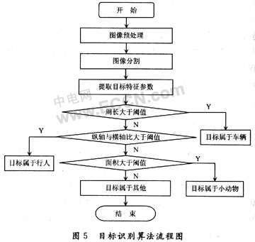 根據(jù)運動目標(biāo)的分類可知,車輛的周長是最長的,所以首先直接判斷圖像中運動目標(biāo)的周長,如果大于某一設(shè)定好的閾值,則可輕易判斷出視場中目標(biāo)屬于車輛。余下的目標(biāo)中,行人比小動物的縱橫軸比值大,設(shè)定縱橫軸比閾值,據(jù)此可以判斷出目標(biāo)屬于行人。最后將設(shè)定一個面積閾值,面積大于此閾值則可判斷目標(biāo)屬于小動物,否則目標(biāo)屬于其他一些環(huán)境的干擾。