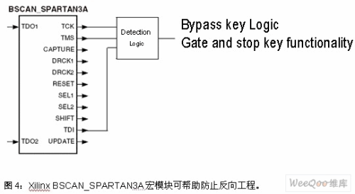 平臺(tái)中, 可在設(shè)計(jì)中使用BSCAN_SPARTAN3A宏模塊,其檢測(cè)邏輯可監(jiān)控FPGA構(gòu)造中的JTAG控制信號(hào),如圖4所示。如果檢測(cè)到JTAG控制信號(hào)的活動(dòng),用戶在設(shè)計(jì)可以立即繞過(guò)關(guān)鍵邏輯或關(guān)斷關(guān)鍵功能,不再執(zhí)行正確的功能。這樣反向工程人員讀到的將是不正確的功能模塊,在不能完成預(yù)期功能的解決方案上浪費(fèi)時(shí)間和資源。