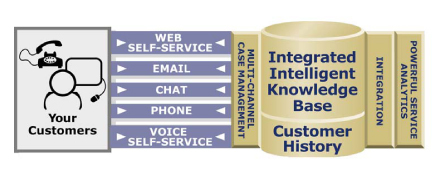Technologies”是一家非常著名的多接觸點(diǎn)呼叫中心供應(yīng)商,這家公司建議采用“通用事故”追蹤機(jī)制,它強(qiáng)調(diào)報(bào)表和歷史紀(jì)錄必須作為任何一個(gè)多接觸點(diǎn)聯(lián)絡(luò)中心不可或缺的組成部分!癛ightnow”提供的以下插圖很清楚地向我們展示了多渠道知識(shí)庫(kù)集成是如何被強(qiáng)制執(zhí)行的。