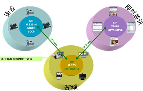視頻/網(wǎng)真系統(tǒng)采用H.323的標準,而即時通訊采用SIP/SIMPLE的標準,二者是無法直接互通的。