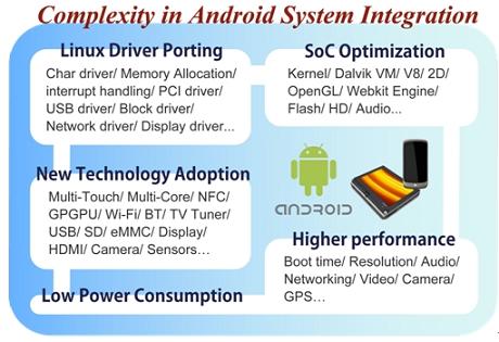 對(duì)廠商而言,開發(fā)一款A(yù)ndroid設(shè)備,不僅僅只是將所有零組件組合成為一個(gè)產(chǎn)品那么容易,最大的學(xué)問便在于將系統(tǒng)單芯片(System-on-a-chip,SoC)、各種新技術(shù)和Android系統(tǒng)進(jìn)行整合,SoC涉及像是Dalvik Virtual Machine、OpenGL、V8、Webkit Engine等上層的演算,與Android間的結(jié)合便必須透過不斷的嘗試與驗(yàn)證,才能研發(fā)出既符合成本效益、又有良好效能的優(yōu)化產(chǎn)品。目前市面上有些SoC廠商已針對(duì)Android系統(tǒng)的特性,提供整合過的SoC平臺(tái),將藍(lán)牙、相機(jī)或上網(wǎng)等常用功能模組預(yù)先寫入,減少終端成品廠商費(fèi)力整合開發(fā)的時(shí)間,但對(duì)廠商而言,這樣的預(yù)先整合是否適合自身產(chǎn)品,以及是否需要再作更細(xì)致的修改,則又是更困難的課題。