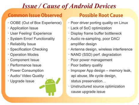 盡管Android系統(tǒng)的普及看似指日可待,但在實(shí)際的產(chǎn)品應(yīng)用上,也有其可能產(chǎn)生的問題風(fēng)險(xiǎn)。Android作為一個(gè)開放式的操作系統(tǒng),是Google提供廠商的操作系統(tǒng)參考架構(gòu)(reference design),廠商能有充足的發(fā)揮空間,以Android為基礎(chǔ)向上開發(fā)設(shè)計(jì)自家產(chǎn)品,但也因?yàn)檫@樣的開放性與自由性,讓廠商在軟硬件結(jié)合的這個(gè)環(huán)節(jié)必須下更大的功夫,像是如何挑選合適的硬件包括基頻處理器、通信芯片、觸控感應(yīng)芯片、天線與存儲(chǔ)器模組等,以及如何調(diào)整出最適當(dāng)?shù)能浖O(shè)定等,更重要的是如何將軟硬件整合,開發(fā)出差異化的產(chǎn)品。這中間所有的細(xì)節(jié)都會(huì)對(duì)產(chǎn)品最終樣貌產(chǎn)生莫大的影響,像是其功能的完整度、使用接口的設(shè)計(jì)、效能表現(xiàn)(例如觸控滑動(dòng)畫面、開啟程序所需時(shí)間)、品質(zhì)可靠度、甚至是后續(xù)的固件升級(jí)動(dòng)作等等。在此百佳泰便試圖以專業(yè)中立的測(cè)試實(shí)驗(yàn)室角度,來點(diǎn)出廠商應(yīng)用Android于手機(jī)、平板電腦或其他設(shè)備時(shí)應(yīng)注意的開發(fā)重點(diǎn),以希冀作為一個(gè)有效的參考資訊。