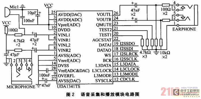 語音采集和播放模塊的作用是將音頻模擬信號轉(zhuǎn)換為數(shù)字信號,并對信號進行PCM編碼。其電路如圖2所示。采用Philips公司的UDA1341 TS型立體聲音頻CODEC進行音頻編解碼。該芯片提供2個麥克風(fēng)輸入,可實現(xiàn)單端輸入、差分輸入等靈活配置,并設(shè)置了可編程增益放大器和自動增益控制器,可保證高質(zhì)量的音頻獲;同時,還集成了聽筒和喇叭輸出的驅(qū)動器,喇叭音量可以通過編程調(diào)整。S3C2440A-40微處理器與UDA1341TS編解碼器通過I2S總線直接相連,并采用DMA發(fā)送/接收方式,完成系統(tǒng)的錄音和放音。