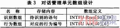為了方便進行對話的管理,本文中設(shè)計了一個對話管理單元,用于對等待識別的語句和等待執(zhí)行的命令進行存儲,在主控制器中通過定義二維數(shù)組來實現(xiàn)。LD3320每次識別最多可以設(shè)置50項候選識別句,每個識別句可以是單字、詞組或短句,長度為不超過10個漢字或者79個字節(jié)的拼音串;谏鲜鲈,本文設(shè)計的對話管理數(shù)組如表3所列。
