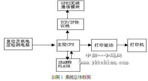 系統(tǒng)整體框架如下,為了控制整個(gè)系統(tǒng)穩(wěn)定運(yùn)行,系統(tǒng)需要一個(gè)微處理器,為了打印出一張憑證,系統(tǒng)需要一個(gè)微型打印機(jī)。因?yàn)橄到y(tǒng)需要通過無線的方式接入Internet,所以該系統(tǒng)還需要一個(gè)無線通信模塊,該通訊模塊可以接入Internet,選用GPRS 通信模塊或者CDMA 通訊模塊。為了接入Internet,僅僅有一個(gè)通訊模塊還不行,還需要遵循Internet 的共有通信協(xié)議。這樣改系統(tǒng)有好幾種組合方式,本系統(tǒng)選用內(nèi)嵌TCP/IP 協(xié)議棧的CPU。采用MCU 及固化了TCP/IP 協(xié)議的芯片組成應(yīng)用系統(tǒng)的核心,應(yīng)用系統(tǒng)可以直接上網(wǎng),硬件電路相對簡單。該方案具有如下優(yōu)點(diǎn);①不依賴PC 機(jī)或高檔單片機(jī),真正實(shí)現(xiàn)8 位單片機(jī)系統(tǒng)直接接入Internet,整個(gè)系統(tǒng)完全自給自足;②使用外圍器件少,系統(tǒng)成由低。