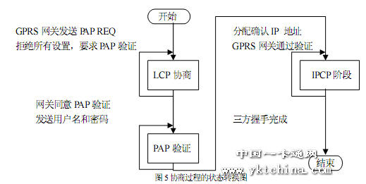 系統(tǒng)的一個(gè)難點(diǎn)是微控制器登陸 GPRS 網(wǎng)關(guān)(GGSN)并與網(wǎng)關(guān)通過LCP、PAP、IPCP 協(xié)議進(jìn)行協(xié)商的過程。LCP、PAP 與IPCP 協(xié)議的幀結(jié)構(gòu)大同小異,最常用的為請求(REQ)、同意(ACK)和拒絕(NAK)三種幀。微控制器與GGSN 各為一方進(jìn)行協(xié)商,任何一方都可以發(fā)送REQ 幀請求某方面的配制,另一方覺得配置不能接受會(huì)回應(yīng)NAK 幀,如果可以則回應(yīng)ACK 幀。為了節(jié)省資源,我們只處理這三種數(shù)據(jù)幀,其它鏈路問題都由微控制器在程序控制下自己重新?lián)芴柦鉀Q。協(xié)商過程大致描述如下:在撥號成功連接后,GGSN 首先會(huì)返回一個(gè)PAP REQ 數(shù)據(jù)幀。我們發(fā)送一個(gè)空 LCP REQ 幀,以強(qiáng)迫進(jìn)行協(xié)議協(xié)商階段。隨后,GGSN 發(fā)送LCP 設(shè)置幀,我們拒絕所有的設(shè)置并請求驗(yàn)證模式。GGSN 選擇CHAP 或PAP 方式驗(yàn)證,我們只接受PAP 方式。然后,進(jìn)行PAP 驗(yàn)證用戶名和密碼過程,在GPRS 中用戶名與密碼都為空,如果成功,GGSN 會(huì)返回IPCP報(bào)文分配動(dòng)態(tài)IP 地址。此時(shí),就完成了與GGSN 的協(xié)商過程。協(xié)商過程的狀態(tài)轉(zhuǎn)換如圖5 所示。