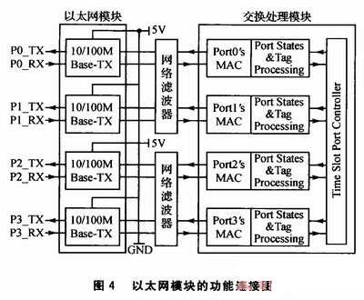以太網(wǎng)模塊的功能連接圖如圖4所示,進(jìn)出以太網(wǎng)接口的信號都需要經(jīng)過網(wǎng)絡(luò)濾波器,網(wǎng)絡(luò)濾波器實(shí)質(zhì)上是一個(gè)選頻電路,它的功能就是允許某一部分頻率的信號順利的通過,而另外一部分頻率的信號則受到較大的抑制。與網(wǎng)絡(luò)濾波器相連的是交換處理模塊中的Port's MAC(M-edia Access Controllers),用來解決在共用信道中產(chǎn)生競爭時(shí)分配信道的使用權(quán)問題。