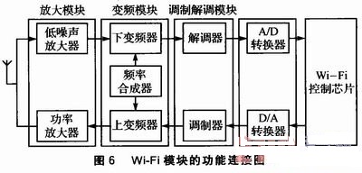 Wi—Fi模塊的功能連接圖如圖6所示。本系統(tǒng)的天線是外置天線,這樣能盡量穩(wěn)定信號。天線與RF射頻模塊相連,RF射頻模塊大致可分為放大模塊、變頻模塊、調(diào)制解調(diào)模塊等有源部件,然后通過A/D、D/A轉(zhuǎn)換與Wi—Fi控制芯片相連。Wi—Fi控制芯片控制整個(gè)無線模塊的運(yùn)行。