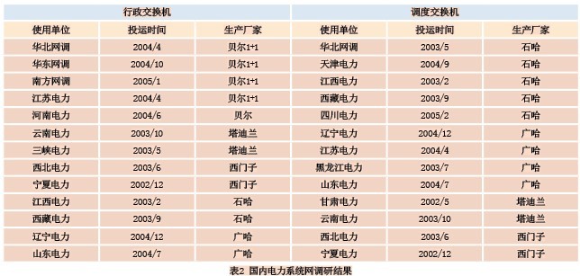 通過對(duì)目前國(guó)內(nèi)電力系統(tǒng)網(wǎng)省一級(jí)的用戶使用交換機(jī)設(shè)備品牌進(jìn)行電話調(diào)研統(tǒng)計(jì),從整體上更能體現(xiàn)交換設(shè)備技術(shù)發(fā)展走向,為軟交換應(yīng)用的可行性評(píng)估提供可靠的數(shù)據(jù)。表2為重點(diǎn)調(diào)研的匯總結(jié)果。